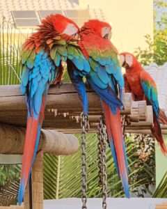 Scarlet macaws monogamous and they bond for life. Once they have form a pair, they hardly ever seen alone, except to feed while the other bird incubates the eggs. Mates show affection by mutual preening and licking each other’s faces. About every one or two years breeding occurs. 2 to 4 round white eggs laid, and incubat for around 24 to 25 days. It is mainly the females who incubate the eggs. The young stay with the adults for up to one to two years. Males and females both care for the chicks. The parents do not raise another clutch until the first chicks.