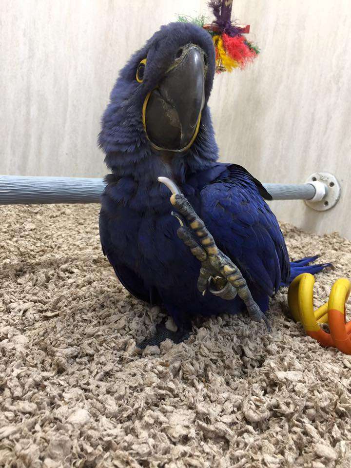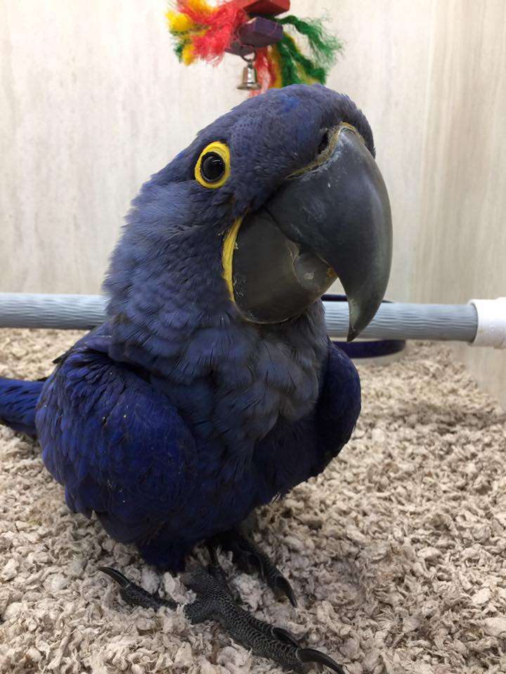 Though somewhat frightening in appearance due to its enormous size and powerful, sharp hooked beak, the hyacinth macaw is something of a gentle giant. Hyacinths are quite gentle by nature. The is easily train by positive reinforcement and tend to bond strongly with their human caregivers.